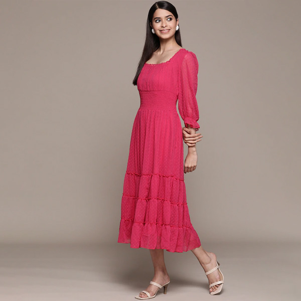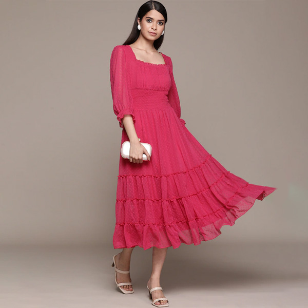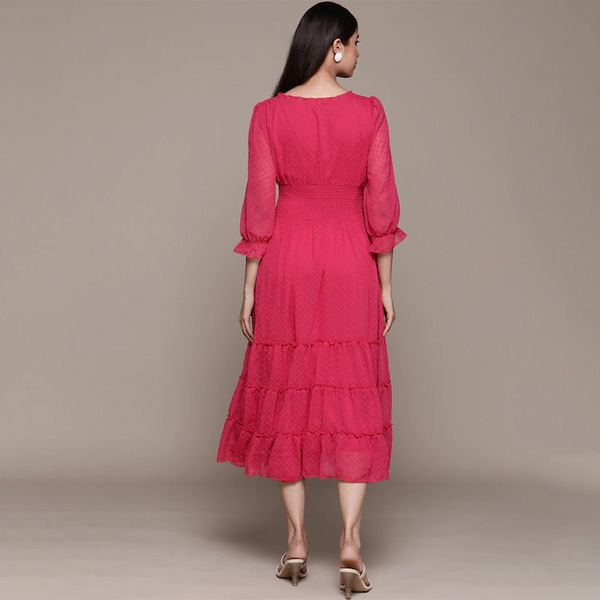 Fuchsia Solid Chiffon Smocked Tiered Midi Dress