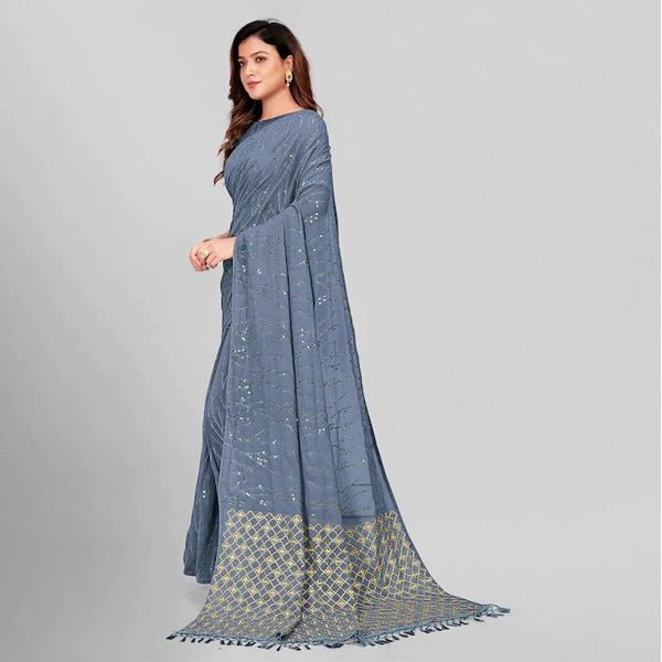 Grey and gold-toned saree. Embellished saree with embellished border Has sequinned detaiL. The saree comes with an unstitched blouse piece. The blouse worn by the model might be for modelling purpose only. Check the image of the blouse piece to understand how the actual blouse piece looks like.