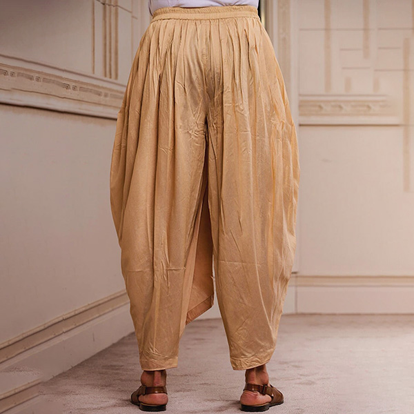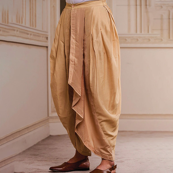 Beige solid mid-rise draped dhoti pant with pleats, has an elasticated waistband, and button closure