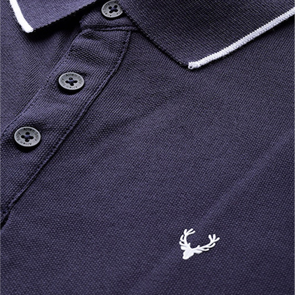 Navy Blue solid T-shirt, has a polo collar, button closure, and short sleeves