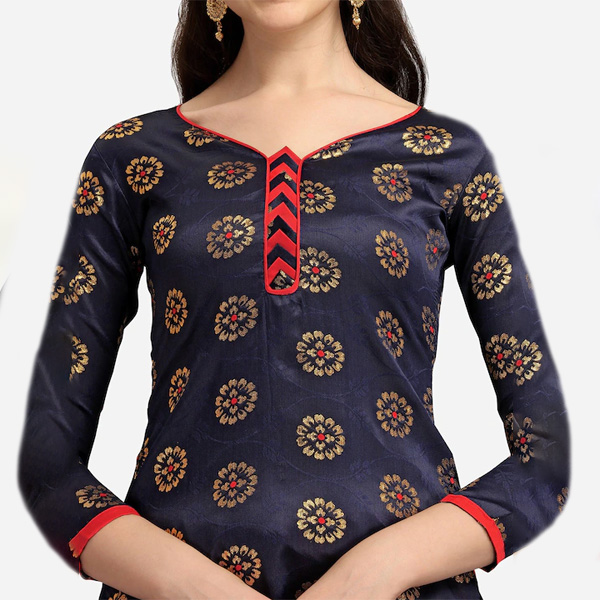 Navy Blue & Red Woven Design Banarasi Unstitched Dress Material