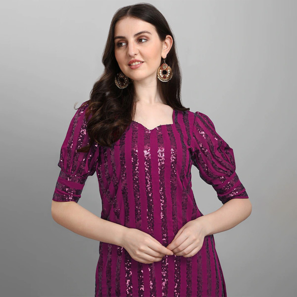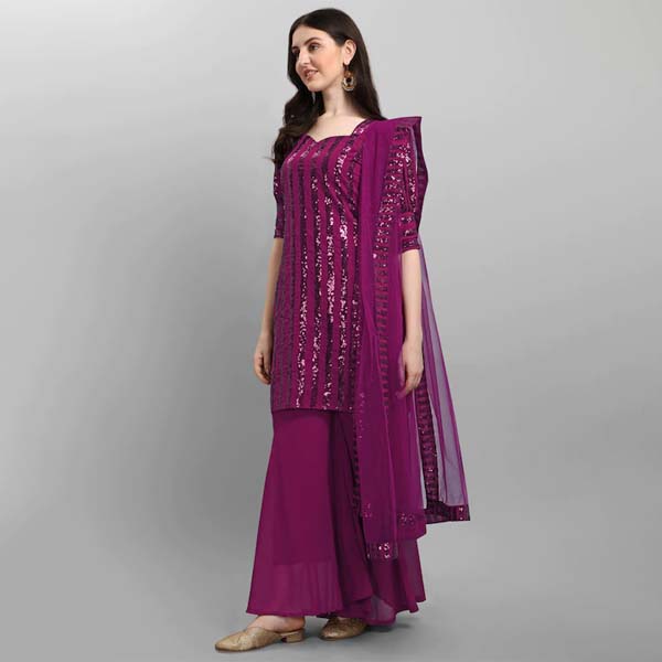 Purple Embroidered Sequined Silk Georgette Semi-Stitched Dress Material