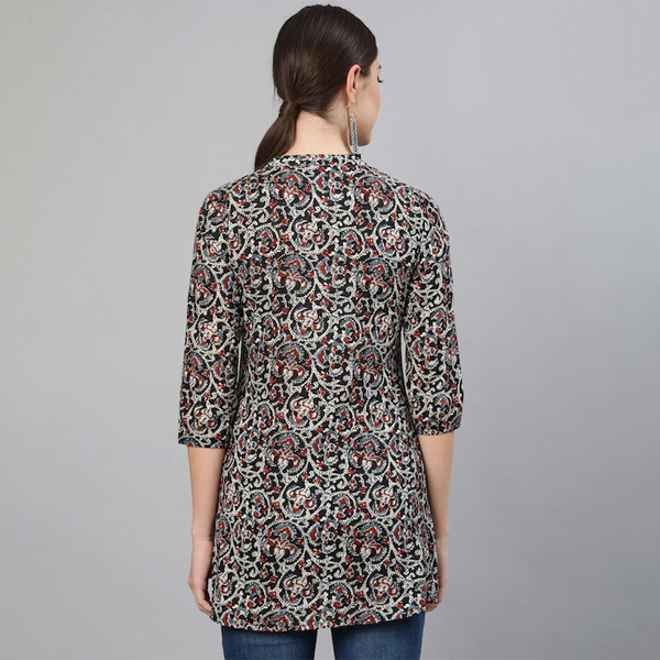 Black, maroon and 0ff-white printed tunic ,has a mandarin collar, three-quarter sleeves, hook and eye closure