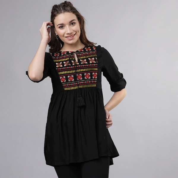Black solid Tunic, has a tie-up neck, three-quarter roll-up sleeves, and Embroidered detail