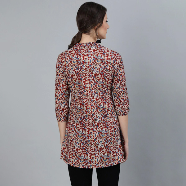 Maroon and Cream-coloured printed Tunic, has a mandarin collar, three-quarter sleeves, and button closure