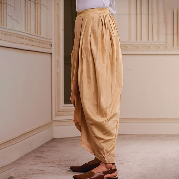 Beige solid mid-rise draped dhoti pant with pleats, has an elasticated waistband, and button closure