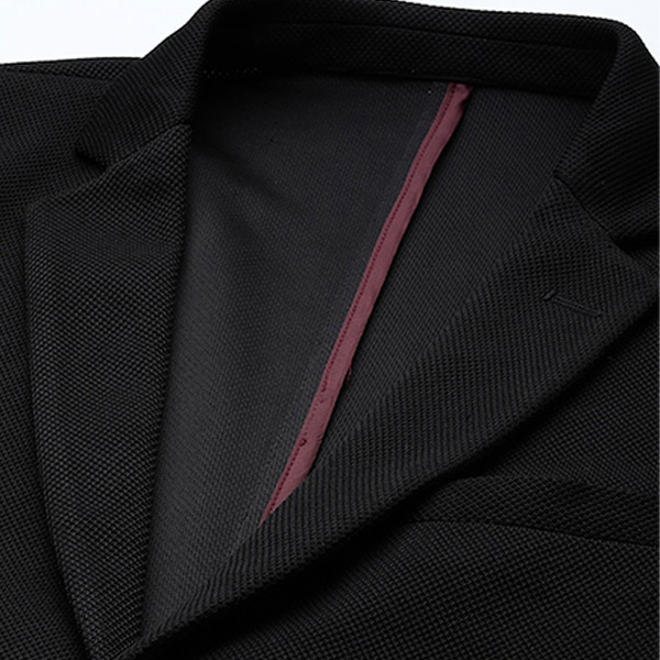 Black textured woven smart casual blazer, has a notched lapel collar, long sleeves, single-breasted with button closure, 5 pockets, and an attached lining
