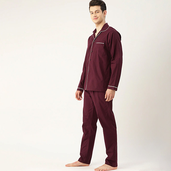 A pair of burgundy solid pyjamas, has elasticated waistband with drawstring fastening and concealed button closure, and two pockets