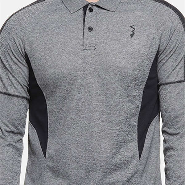 Grey and Black colourblocked T-shirt, has a polo collar, and long sleeves