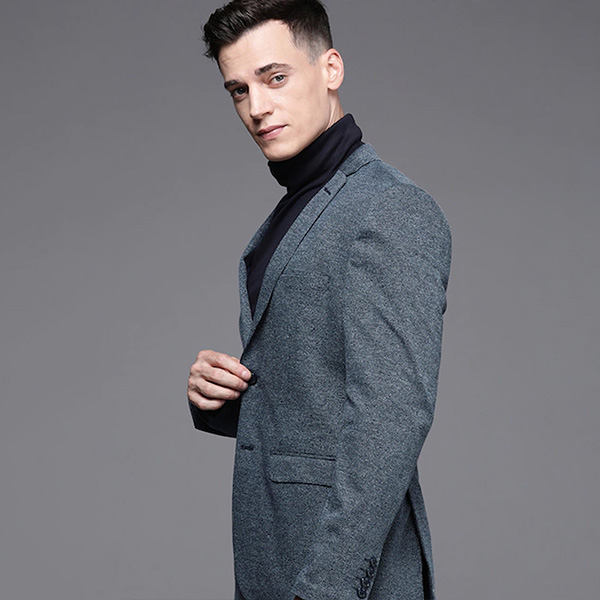Navy blue self-design single-breasted formal blazer, has a notched lapel, button closure, long sleeves, two flap pockets, one welt pocket, and an attached lining
