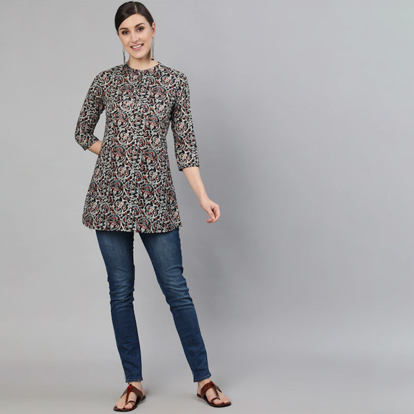 Black, maroon and 0ff-white printed tunic ,has a mandarin collar, three-quarter sleeves, hook and eye closure